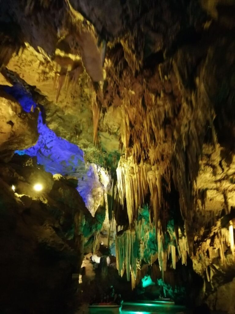 Ancient wells, Dragon Pools, and the Hundred Steps Pond are among the many attractions that inspire visitors’ daydreams and leave them spellbound. On the left side, a ‘harbor’ is illuminated by lights, casting the cave’s features in an inverted reflection on the water’s surface. At the end of the cave, a deep, clear pool awaits, its depth unfathomable, with a chilling mist that sends a shiver down one’s spine.