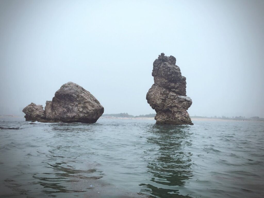 The Meng Jiangnu Tomb is situated in Suizhong County, Huludao City, Liaoning Province. It consists of two towering rocks standing firm amidst the sea, reaching a height of over twenty meters, with one being taller than the other, and they lean against each other affectionately.