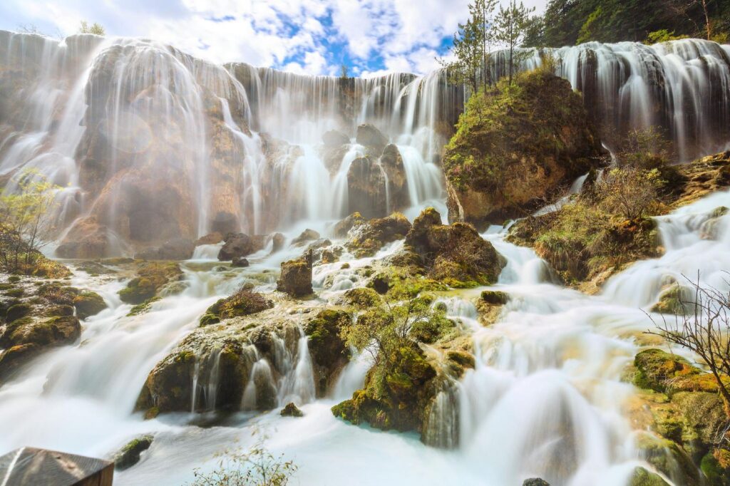 Pearl Shoal Waterfall is the largest travertine waterfall in Jiuzhaigou. Originating from the melted snow in the mountains, it cascades down from a height of 21 meters into the valley with a thunderous roar, creating thousands of splashing waves. The rapid water here appears white, making it the most powerful and loud among all the rapids in Jiuzhaigou. The plank road on the left side of the rapids offers an excellent vantage point for admiring the waterfall.