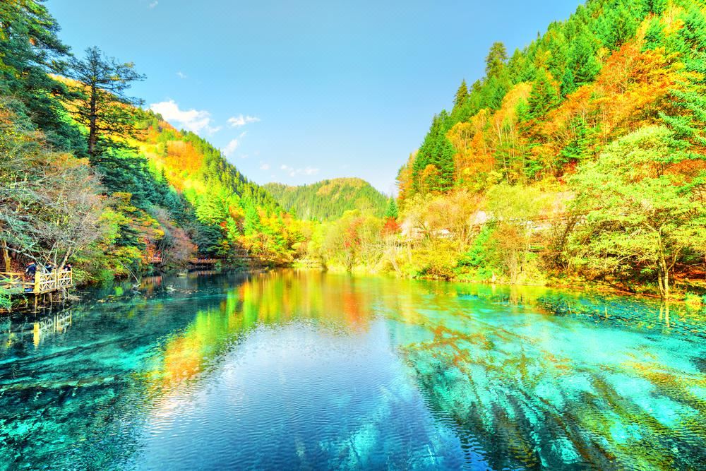 The Colorful Pond is located in the southern section of Zechawa Gully. It is an especially colorful pond in Jiuzhaigou and does not freeze throughout the year. It is famous for its beauty, variety of colors, purity, and transparency. Due to the high content of calcium carbonate in the water, the lake water shows mottled light and shadow. When there is sunlight, it is a great time for shooting. Different colors will appear at different positions and angles.